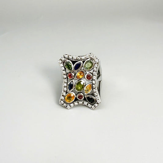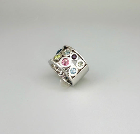 White Gold plated Silver Ring with Sapphire, Topaz, Tourmaline & Spinel