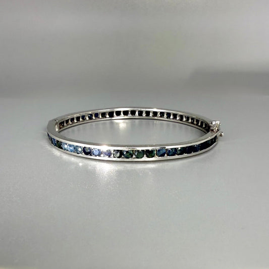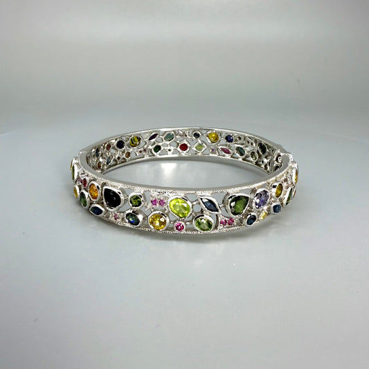 Silver Bangle plated in white gold with a diverse array of Sapphires