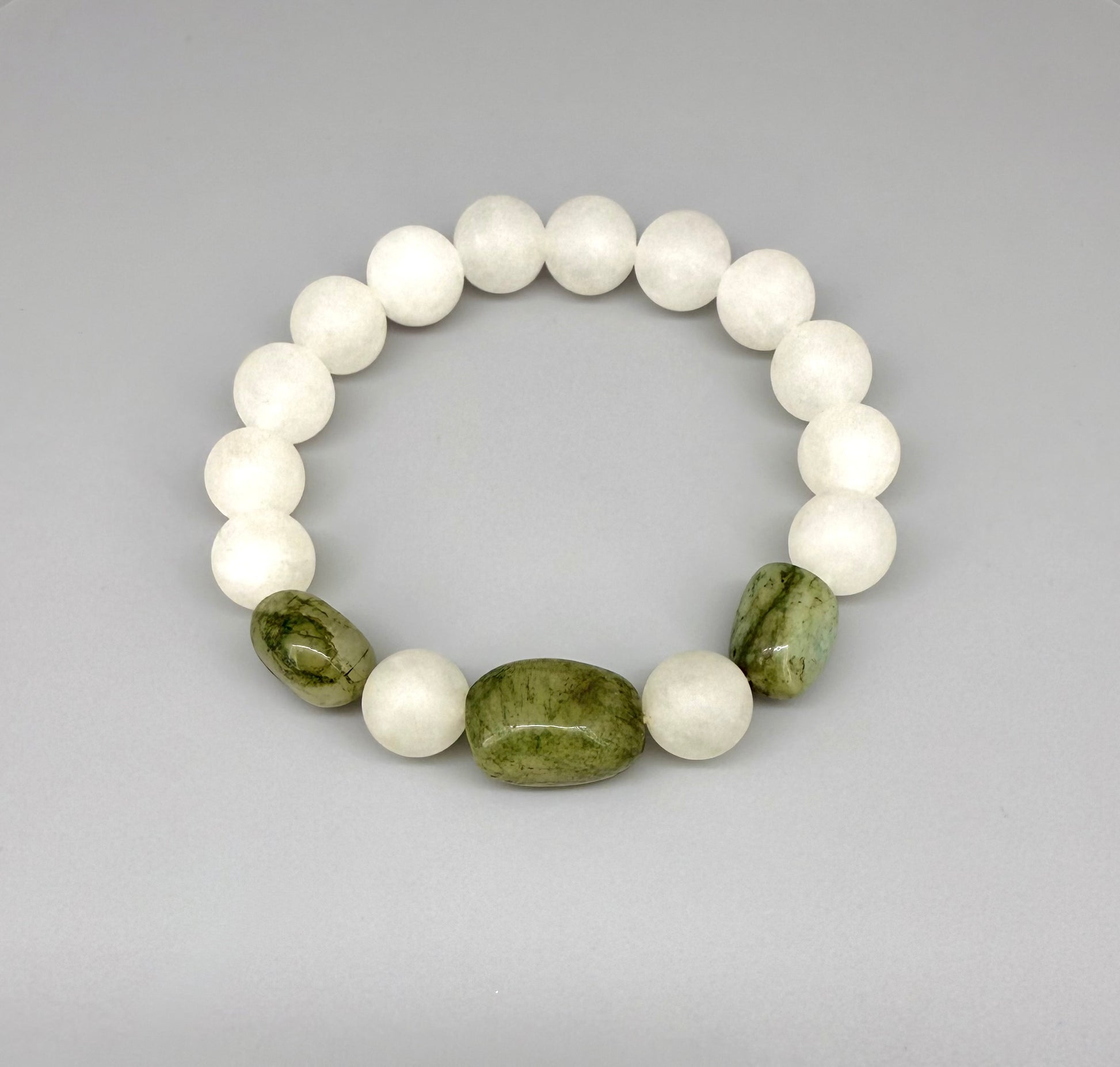 A bracelet of graceful charm, handcrafted from soft white jade beads accented with three larger oval emerald stones. Jade is valued as a stone of harmony and calm, while emerald is treasured as a gem of growth and vitality. The contrasting colors and shapes create a refined design that blends serenity with vibrant energy. Handmade with care, each bracelet is unique in character.