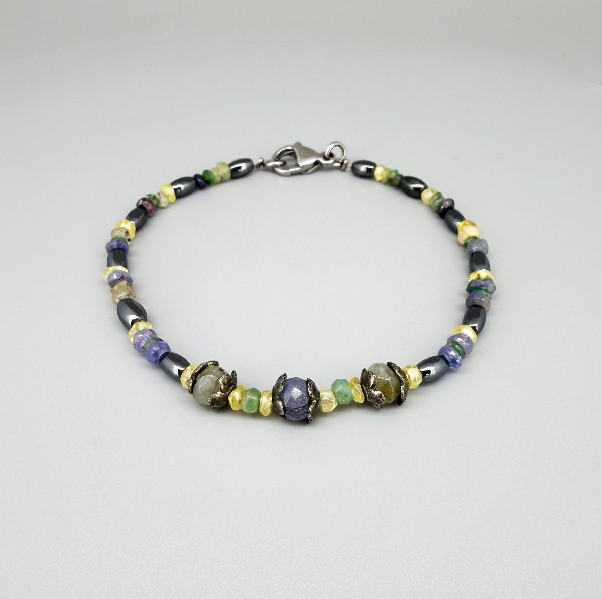 A bracelet of balance and refined energy. Handcrafted from faceted sapphires and hematite beads, it combines the deep blue, green, and yellow clarity of sapphire with the metallic sheen of hematite – a union of calm strength and subtle brilliance. The faceted finish catches the light beautifully, creating a soft sparkle with every movement. Elegant, minimal, and full of quiet character.