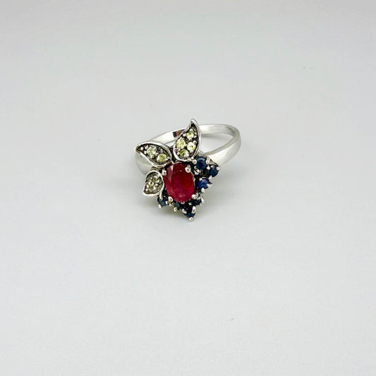 White Gold plated Silver Ring with Ruby, Sapphires & Peridot