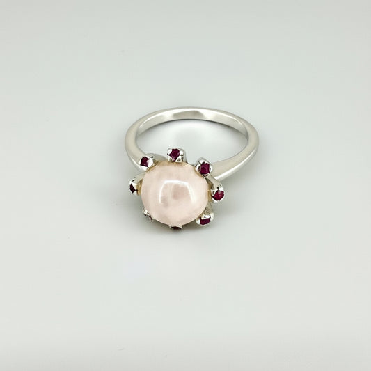 White Gold plated Silver Ring with Rose Quartz & Rubies