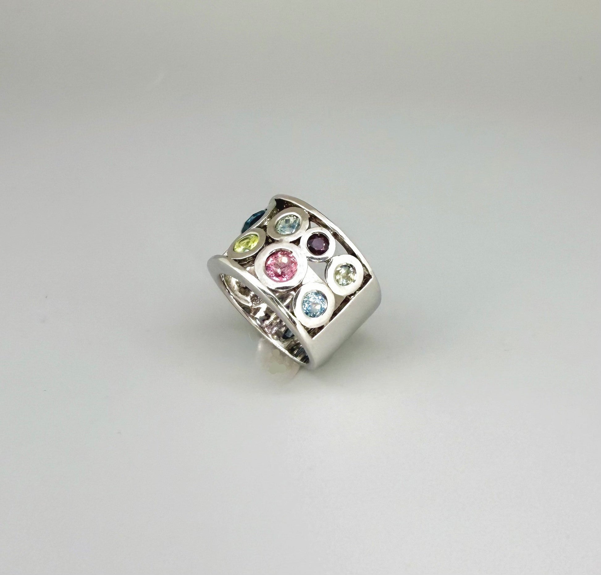 This ring celebrates the vivid beauty of sapphire in all its natural colors. Crafted in white gold-plated sterling silver, it features faceted Sapphires from our Sapphire Collection set across a polished wide band. Each gemstone adds its own hue — from royal blue and golden yellow to soft pink and green — creating a harmonious expression of elegance, energy, and individuality.