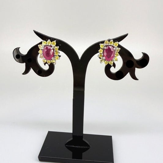 White Gold plated Silver Earrings with Ruby & Sapphires