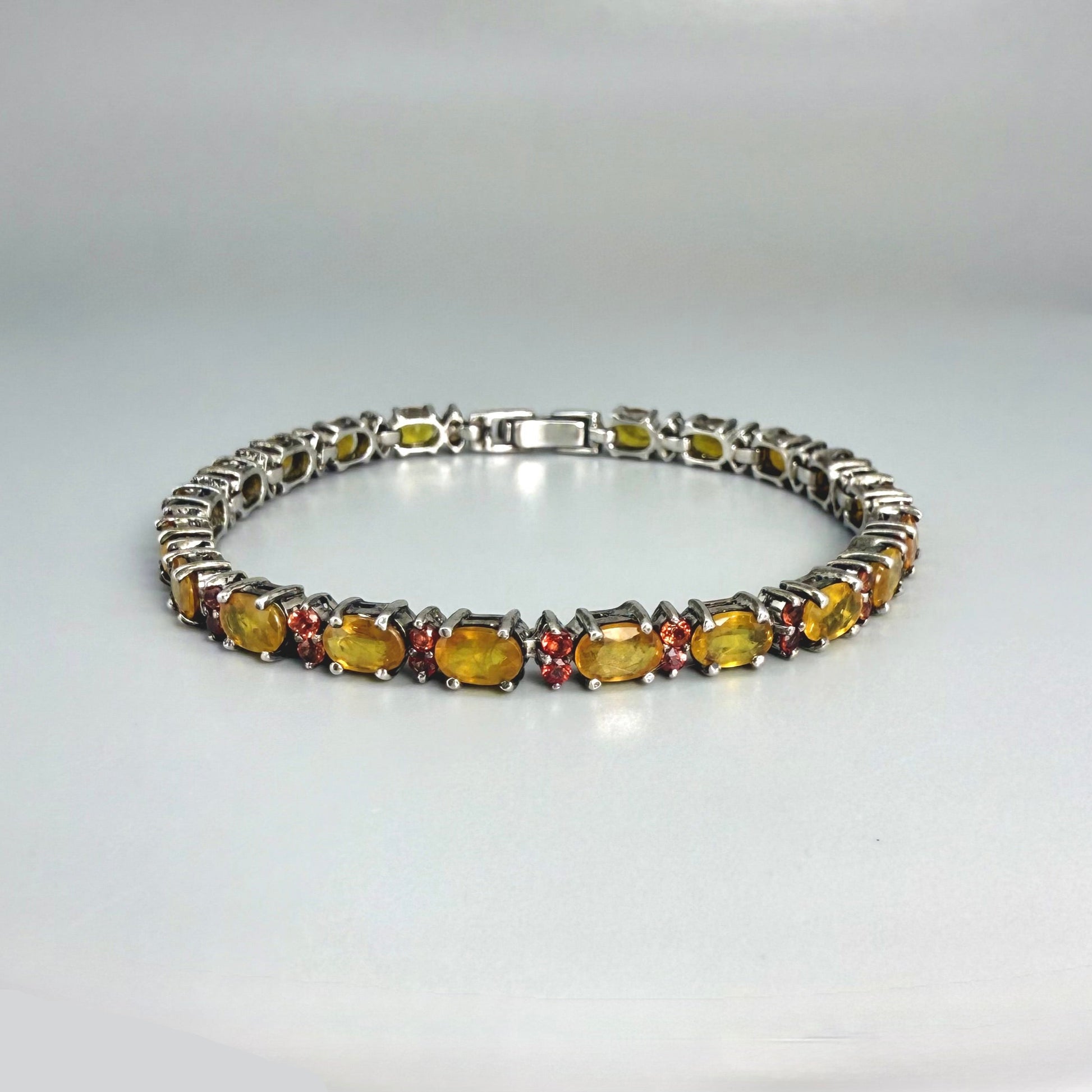 A bracelet that captures the warmth of a setting sun. Alternating shades of yellow, orange, and red sapphires shimmer in perfect harmony, each gem faceted to reflect a golden radiance. Set in sterling silver with white gold plating, this piece balances fiery vibrance with refined sophistication – a jewel that glows with energy and grace.