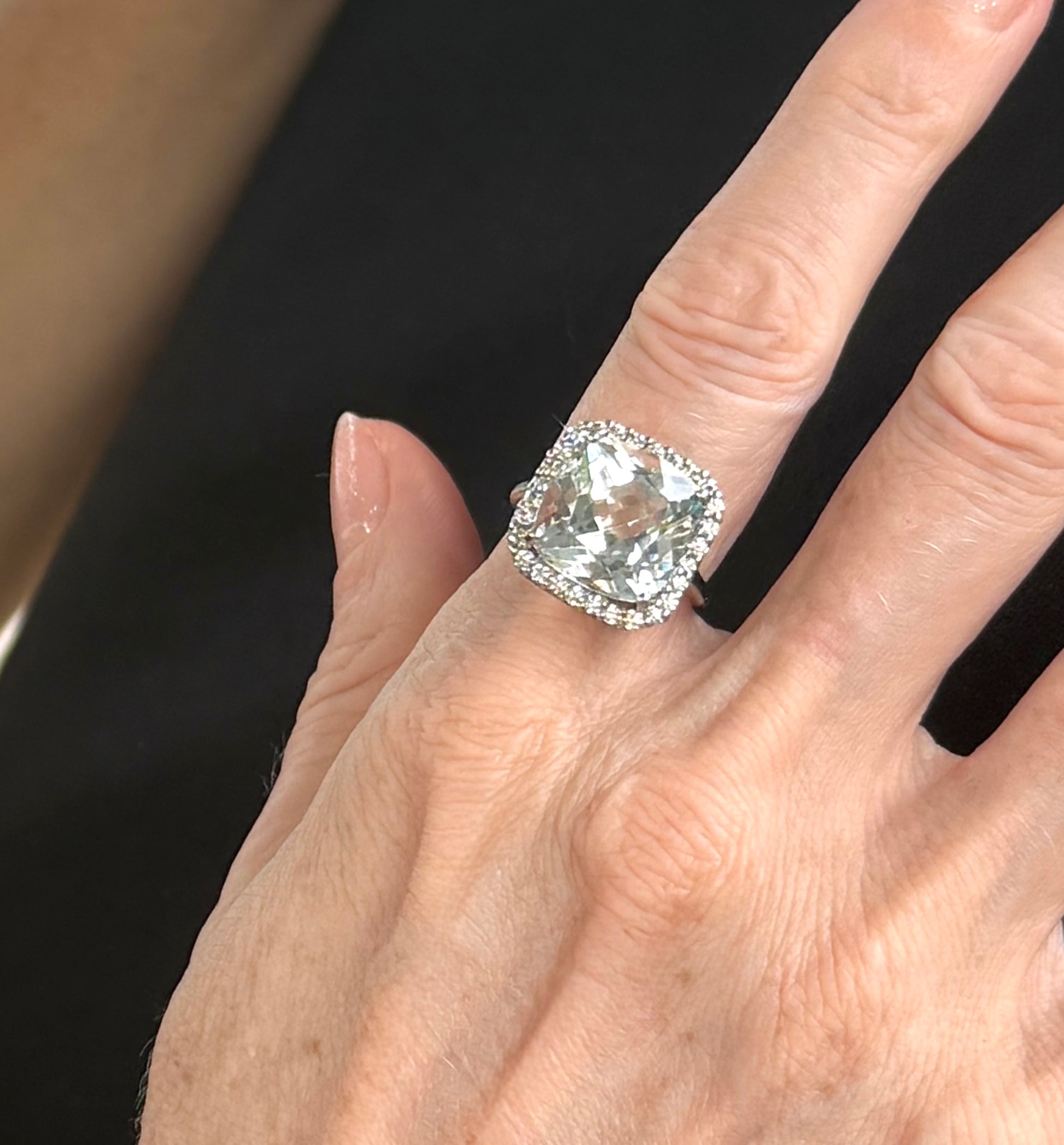 This ring highlights the timeless union of silver and gemstone. Crafted in white gold plated sterling silver, it is adorned with a Topaz in the center framed by small Topaz that radiate natural beauty. A design that balances sophistication and everyday wear, making it a jewel to treasure in every moment.